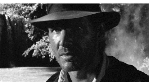 It’s one of the most unforgettable opening acts of any 20th century film. In the midst of a dense jungle, a mercenary pulls a gun on the man paying the bills in the search for buried treasure, hoping to pull a double-cross now that the payoff is near. With the crack of a bullwhip, however, the disarmed man scurries off into the jungle. The hero turns and we see for the first time the sweaty, unshaven, handsome face of Harrison Ford as Indiana Jones in Indiana Jones and the Raiders of the Lost Ark (shown above). Raiders, as fans now call it, remains one of the highest-grossing films ever, launched the Indiana Jones film franchise, and continues to rank among the greatest action-adventure films ever made. But could it be even better as a black and white, silent movie?