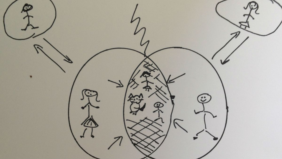 You know those family bumper stickers that show the census of the mini-van’s family, down to the pets? There’s no sticker to illustrate exactly what your family situation is. Maybe it would be you on one side, your semi-ex-spouse on the other side, the children in the middle, in your shared house, and, off in a separate circle somewhere, another partner.