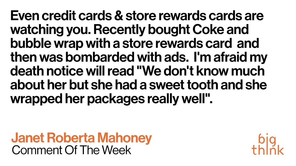 Janet Roberta Mahoney: Even credit cards & store rewards cards are watching you. Recently bought coke & bubble wrap with a store rewards card and got home to an email “based on your recent purchase we recommend this soda stream machine for $80” and then was bombarded with ads for bubble wrap from Amazon. I’m afraid my death notice will read “We don’t know much about her but she had a sweet tooth and she wrapped her packages really well”.
