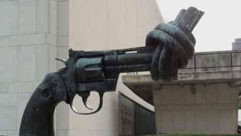 Photo: “Non-Violence” (also known as “The Knotted Gun“) by Carl Fredrik Reuterswärd at the United Nations in New York. Via Wikimedia.