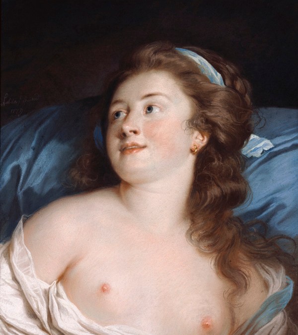 “How could a female artist call attention to her professional work without jeopardizing her personal honor?” Auricchio asks. “Labille-Guiard offers one model.” In pre-revolutionary France, art for women meant miniatures and pastels—the pastimes of women looking to refine themselves into acceptable wives, not to forge careers. Just to exhibit artwork was a bold step for a woman of the 1780s. Labille-Guiard stepped even bolder by exhibiting works such as her 1779 pastel, Head of a Young Woman, also known as Delightful Surprise (pictured). Shorn of the mythological “cover” of most nudes of the time, Labille-Guiard’s subject serves up sex with a side order of youthful innocence. Such actions brought accusations upon Labille-Guiard that she herself traded sex for art instruction and, perhaps, even enticed male artists to allow her to sign their work as her own.