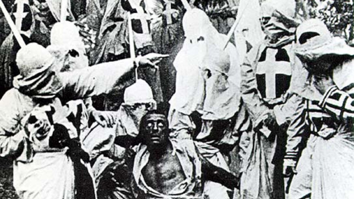 [Image: Hooded Klansmen catch the “renegade” former slave Gus, played by white actor Walter Long in blackface, during the days of Reconstruction. Image source:Wikipedia.]