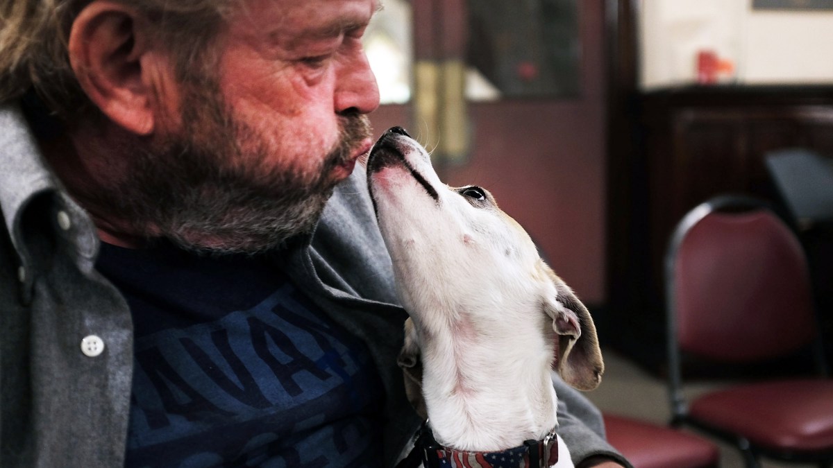 Image caption: PHILADELPHIA, PA – SEPTEMBER 22: Craig, who is homeless, sits with his dog Chester at the Broad Street Ministry, (BSM) which serves thousands of free meals five days per week while also providing the homeless with a mail center, a clothes mending facility, counselling and medical screenings for the homeless and those that are in financial distress, on September 22, 2015 in Philadelphia, Pennsylvania.