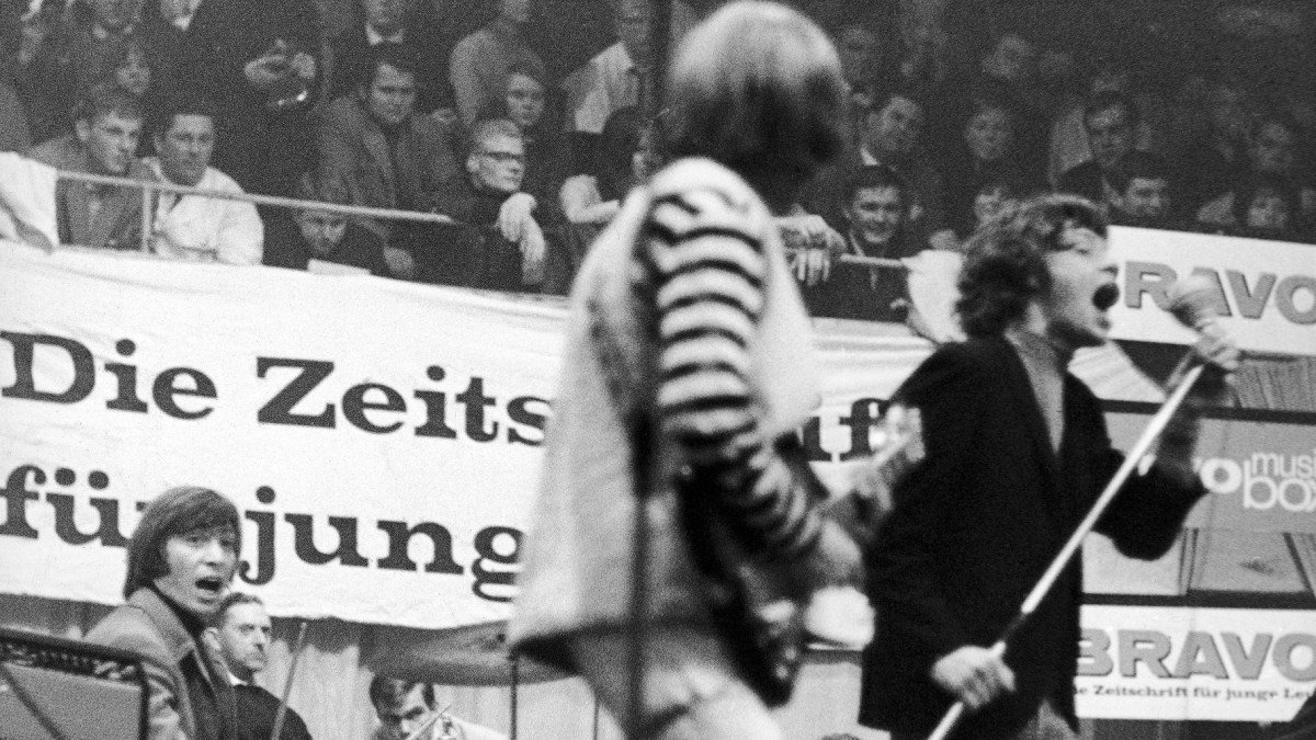[Image:The Rolling Stones perform in Munster, Germany, on September 11, four days after recording “Get Off of My Cloud” in Hollywood. From left:Charlie Watts on drums, Brian Jones on guitar, and Mick Jagger. (Courtesy of the Associated Press/Schroer)]
