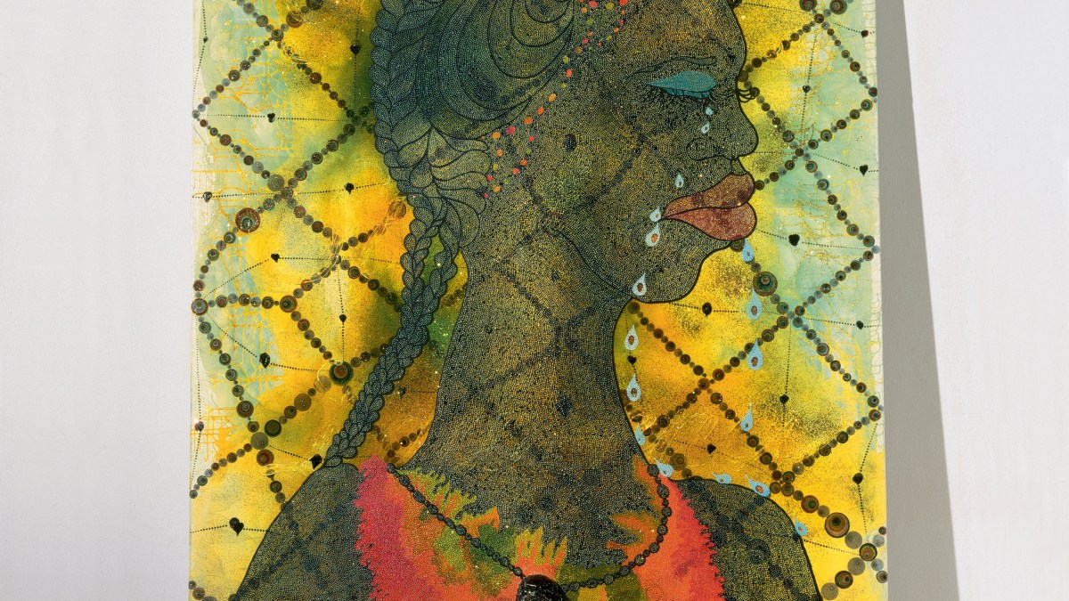 Ofili’s 1998 painting No Woman, No Cry (pictured) stands as just one example of the artist sullying on the surface what is already sullied within. Borrowing the title of Bob Marley’s reggae hit, Ofili dedicated the work to the mother of London teenager Stephen Lawrence, whose racially motivated murder revealed the racist underside of the London police force that tried to cover it up. Tiny photos of Lawrence make up the tears that fall from the woman’s face as the title appears in colored pins inserted into balls of dung at the foot of the painting. In an image both specific and universal, Ofili plays with multiple meanings to show us the face of racism as well as its consequences.