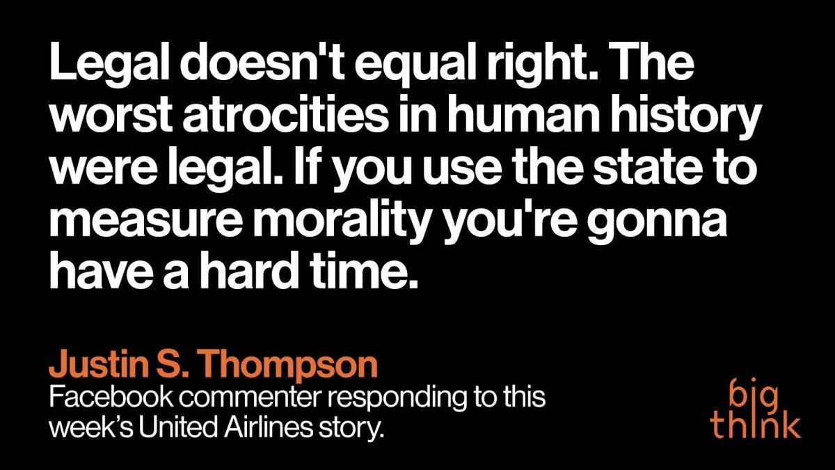 1. Justin S Thompson Legal doesn’t equal right. The worst atrocities in human history were legal. If you use the state to measure morality you’re gonna have a hard time.