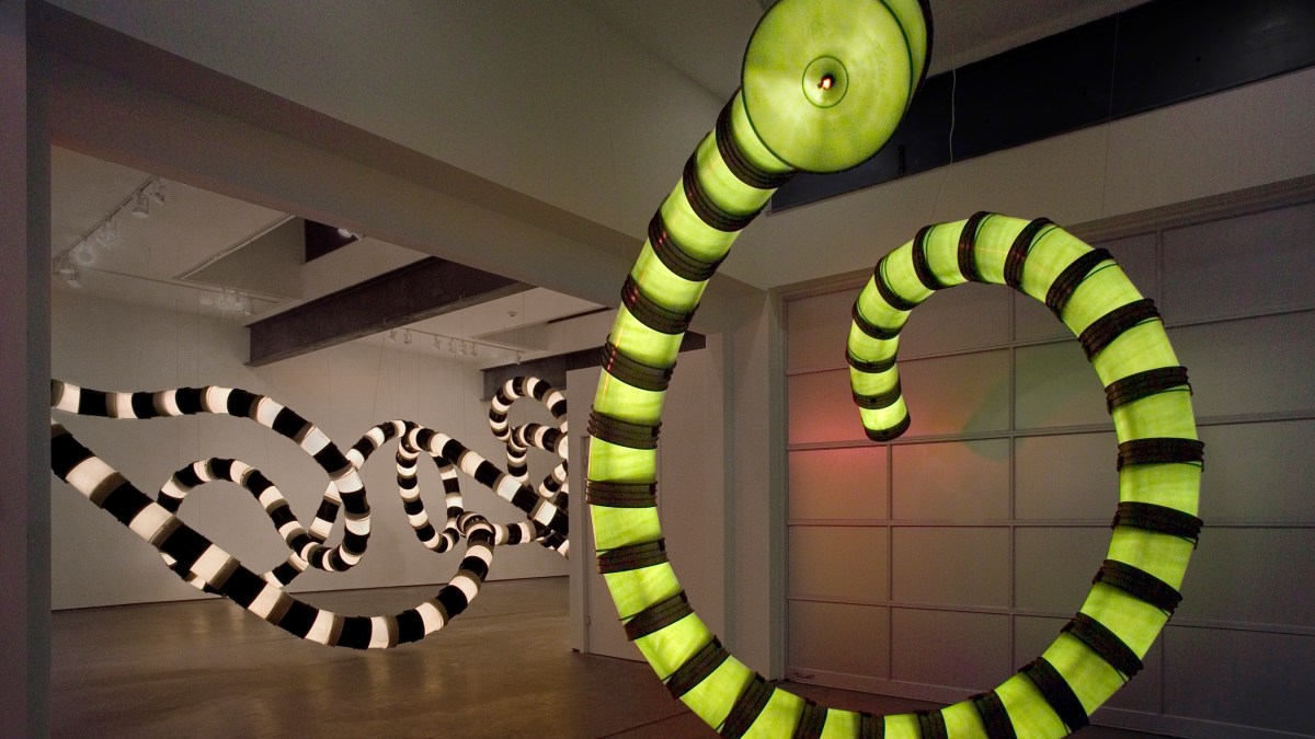 Peters works with the materials at hand to create fascinating works that glimmer and twist as if alive, such as the 2008 sculptures shown. What makes this exhibition especially exciting is that Peters will not only create new sculptures especially for the installation, but will also be working for a month with local students to create the art. Known for sometimes working with trash, Peters will create treasures that exist not just for the moment of the exhibition, but will live on in the imaginations of the students he includes in the process. “People encounter such installations as a speed bump in their perceived reality,” Peters has written in explanation of his art. “Once the installation is removed, the memory of that ‘bump’ is a lingering consciousness of the limitations we impose when restricting reality to face value alone.” Anti.Gravity.Material.Light asks us to slow down in the race of our lives and look behind the scenery surrounding us to the deeper truths. Like much contemporary art, Peters’ work pushes against old boundaries and, if you will, finds new frontiers of consciousness, awakening us to witness whole new purposes to everyday materials that may inspire us to find whole new purposes to our everyday lives. Taken to a metaphorical extreme, each of our lives is an installation—a temporary work of art—that lives on afterwards, if at all, only in the memory of others. Such ideas are not purely contemporary—they’re timeless—but contemporary art at its best makes us ponder them best—in the here and now.