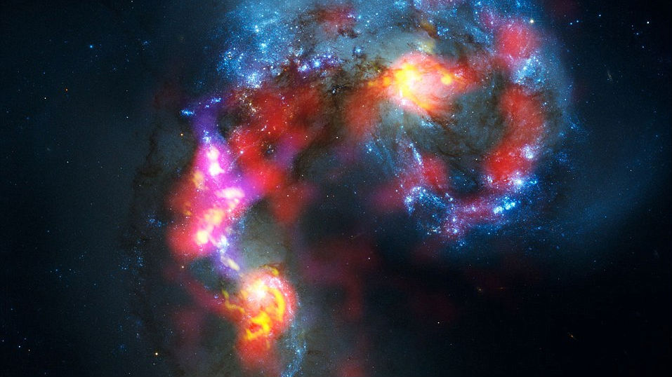 The world’s most expensive and complex ground-based telescopeAtacama Large Millimeter/submillimeter Array (ALMA) has just offered its unique views of deep space, including images of two galaxies colliding, here: