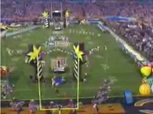 Quite simply, the performance was a mess. In my opinion, the organizers of the entertainment tried to blend together way too many thematic elements – at the same time as the Cirque Du Soleil performers were on the field, some sexy Latin singer was on a separate stage doing her thing and people completely unaffiliated with Cirque Du Soleil were running around the field, displaying artwork from a local Miami artist. Moreover, the circus performers were “dumbed down” for the mass audience. Most of them were dressed up like rabid college football fans (complete with face paint) and college marching band members and then forced to do the same repetitive acrobatics over and over and over again. On a big screen TV, the field in Miami just looked like an unintelligible and riotous clash of color and sound.