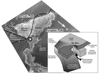 A series of recent publications (Gvirtzman and Nur, 1999; Doglioni et al., 2001; Schellart, 2010) places Etna into a context of slab rollback related to the subduction of Ionian oceanic lithosphere below the Calabrian arc. Slab rollback means that the bend where an oceanic plate starts descending into subduction moves gradually away from the subduction zone due to the weight of the subducting plate, and consequently it sort of tears the subduction zone and the overriding plate into the direction of the subducting plate. In the case of the Ionian plate subduction this would mean that the subduction zone migrates southeast, which is well illustrated here at Highly Allochthonous. This leads to the tearing open of a gap between the subduction setting of the Ionian oceanic lithosphere and the Calabrian arc to the east, and the continental collisional setting of Sicily to the west, which in turn causes decompression and the formation of magma in the upper mantle below this opening gap, or “window”. The magma rises along the intersection of a number of major regional fault systems and feeds the activity of Etna.