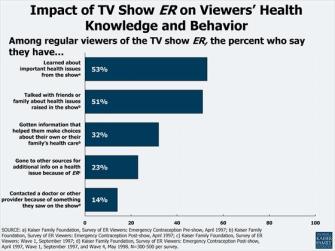 For example, working in collaboration with experts, screenwriters for the series ER purposely inserted plot scenarios intended to raise attention to beneficial health behaviors. Evaluation of the efforts found important impacts in raising awareness, discussion, and interest in the featured health topic among viewers. More recently, a special issue of the American Journal of Bioethics evaluated the use of programs such as House to teach viewers–even medical students–about ethics.