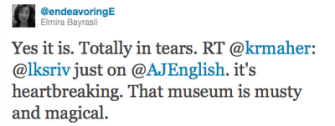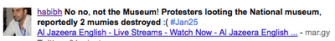Very soon into the revolt, the Egyptian government took the drastic step of shutting down access to information and communications systems (save landlines). As of this writing, reports are that all access to servers and mobile phones have been shut down, as well. Rather than inhibit protest, this has coincided with and may have added impetus for a swelling of protest, with people gathering en masse in the hundreds and thousands. (The extent to which this is a tech or a social media revolution has been debated by commentators for days– and will continue to be so. But similarly to what I’ve written before, for the moment this argument, while worth studying in the abstract, is besides the point.) This fight is playing out on the streets. The protesters are fighting no matter which technologies are available, willing to put themselves at risk to protect what is important to them. And one of the things they took to the streets to protect was their museums.