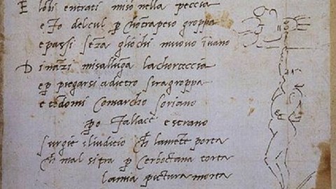 Barkan first paints an interesting backdrop of how words and images operated up to and within the Renaissance. As far back as Cimabue, artists placed words in their art in coordination with the images “in the interest of mutual elucidation,” as Barkan puts it. Whereas Leonardo da Vinci in his illustrated notebooks used images and text to “nail down the truth,” Barkan argues, in Michelangelo’s illustrated writings “the juxtaposed figure and word tend rather to signal the artist’s deepest uncertainties.” If Leonardo knows all the answers, Michelangelo asks all the questions.