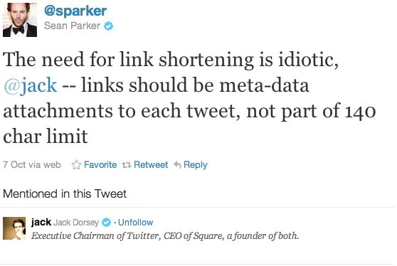 On Friday, Sean Parker took issue with that and told Jack Dorsey about it (with a tweet of course, pictured above). What ensued was a great public discussion on how twitter should treat links. Several talented product people chimed in with their thoughts. That link is a storify containing some of the main points of the tweets, so you can get the gist of the discussion (it is in no ways a complete log of the discussion).