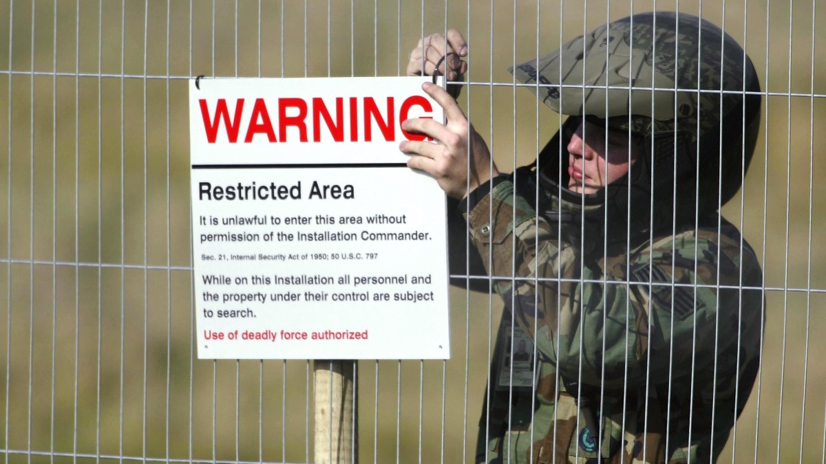 Cover photo: A U.S. Air Force serviceman hangs a warning sign on the perimeter fence March 19, 2003 at R.A.F. Fairford, England. (Photo by Julian Herbert/Getty Images)