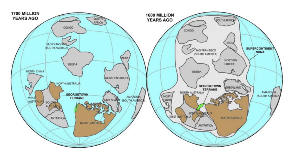 When the supercontinent Nuna broke apart 300 million years later, the Georgetown area remained stuck to Australia while North America drifted away.