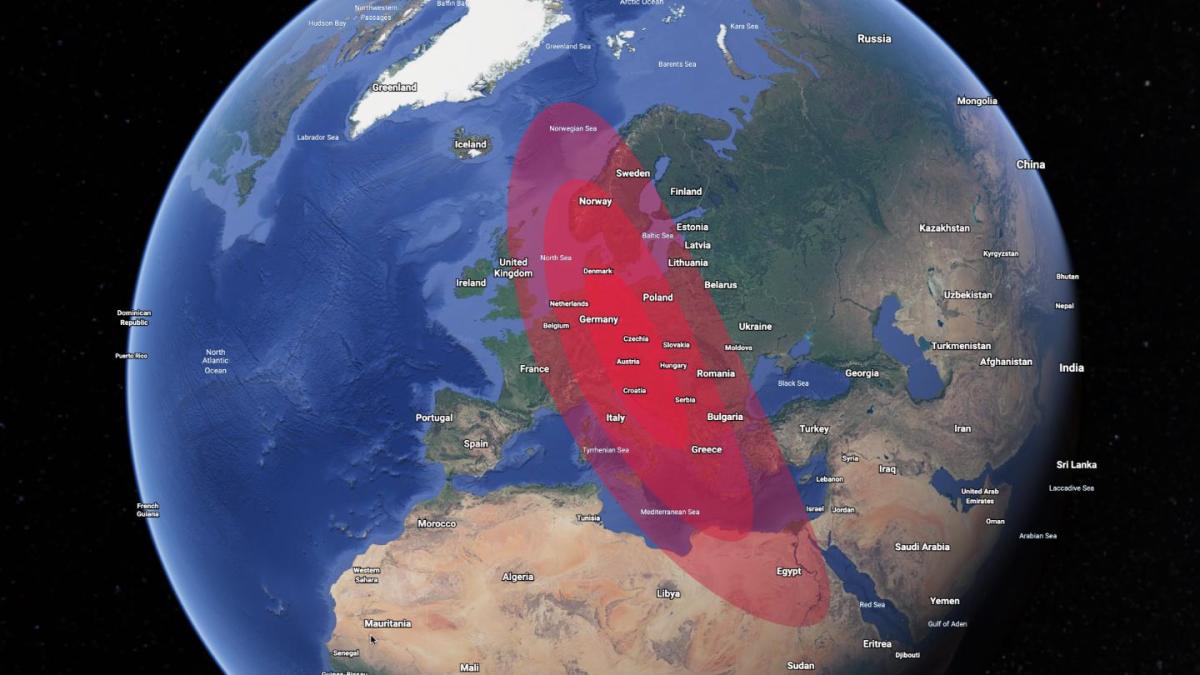 • Day 3, “June 30” — Images from the world’s four largest telescopes reveal the area in Europe that will be hit. Space-based infrared measurements narrow the object’s size to between 35 and 700 meters. This would pack a similar punch as a 1.2-megaton nuclear bomb.