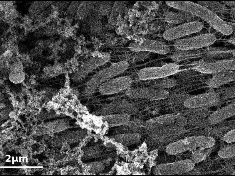 What’s unusual about Shewanella oneidensis is that it can create nanowires for transferring electrons, a fact that “lends itself to connecting to electronic devices that have already been made,” Sawyer elaborated, calling it “the interface between the living world and the manmade world that is fascinating.”