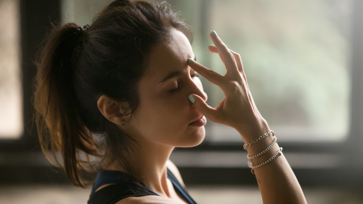 Place the index and middle fingers of your right hand on your forehead. Use your thumb to close your right nostril while inhaling through the left nostril, then close the left nostril with your ring finger and exhale through your right nostril. Repeat this for at least two minutes, then sit quietly for another minute or two, breathing normally.