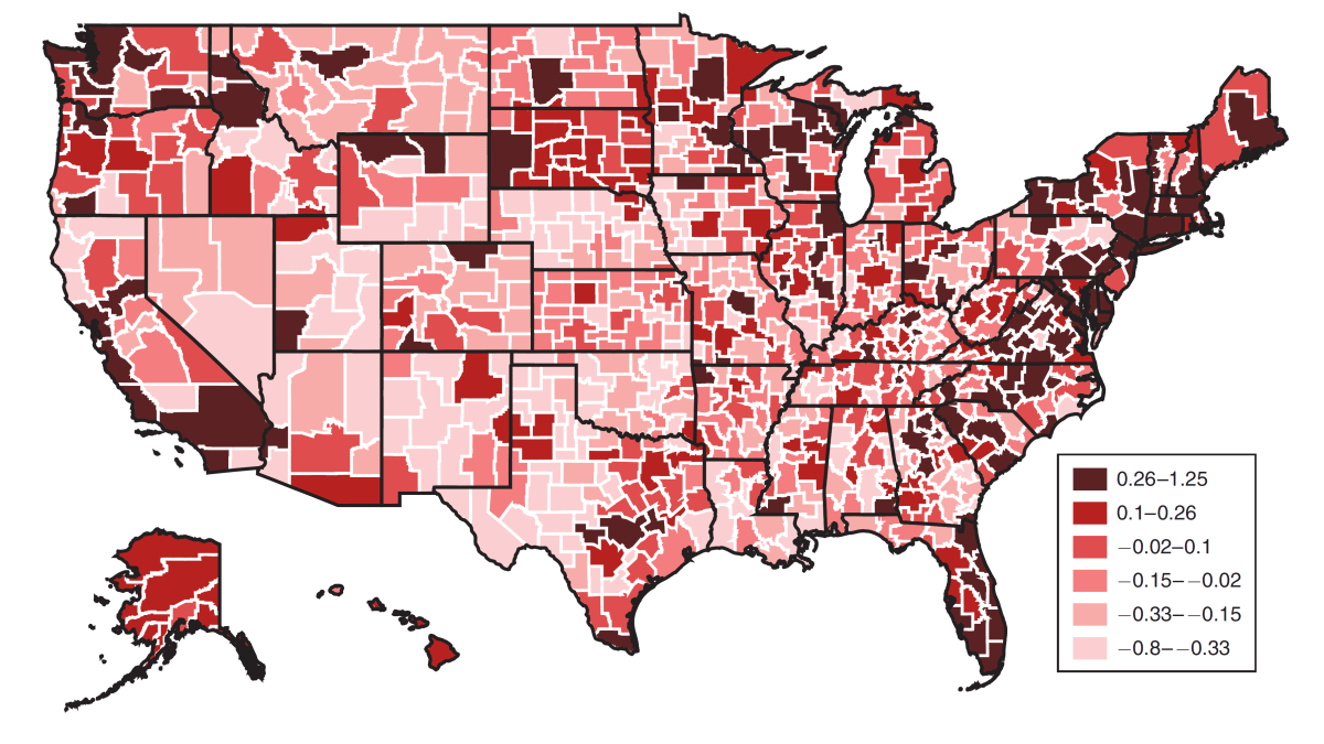 This map shows the effect on life expectancy for a 65-year-old moving to each commuter zone in the United States. The darker shades represent a positive effect on life expectancy, while the lighter colors represent negative health effects.