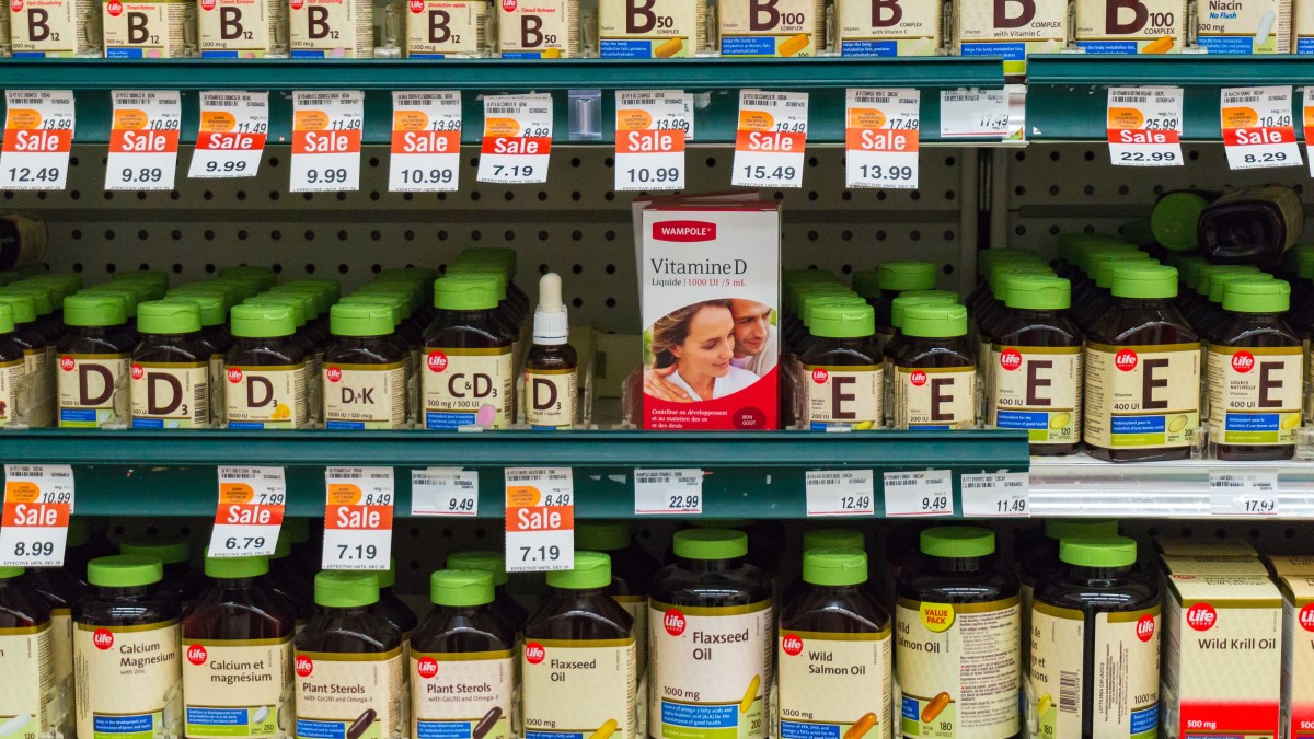 Vitamins supplements on display in a drugstore or pharmacy. Reduced price makes them even more attractive. (Photo by Roberto Machado Noa/LightRocket via Getty Images)