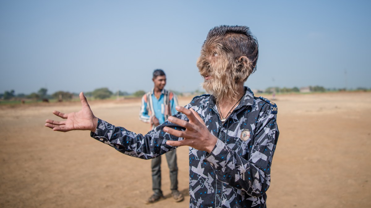 Lalit Patidar, an Indian schoolboy, who suffers from the “Werewolf Syndrome,” pictured with his sisters on January 25, 2019 in Ratlam, Madhya Pradesh, India.