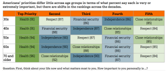 The top priority for every age group was health but as you can see on this chart, the secondary priorities shifted depending between the decades: