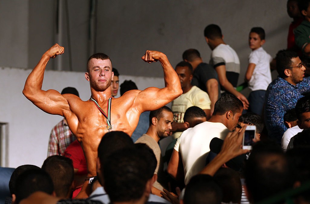 An Iranian man wearing a cross necklace flexes his muscles while posing for a picture at a modern gym in the capital Tehran on February 27, 2018. Photo: Atta Kenare/AFP/Getty Images