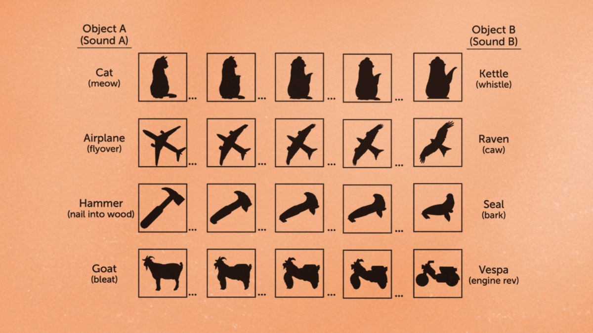 They then showed these images to participants, together with natural sounds that were related or unrelated to one of the objects, and asked them to decide what they had seen by clicking a button. For example, when viewing an image created by morphing an airplane with a bird, they heard the sound of an airplane, a bird, or a hammer.
