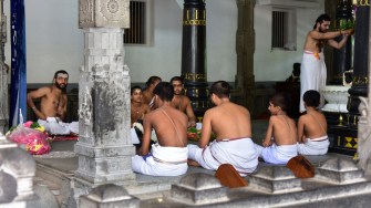 Morning rituals at the Ramanasramam shrine in India. Young Brahmin boys chant mantras while the head priest performs abhishekam. (Photo: Shutterstock)