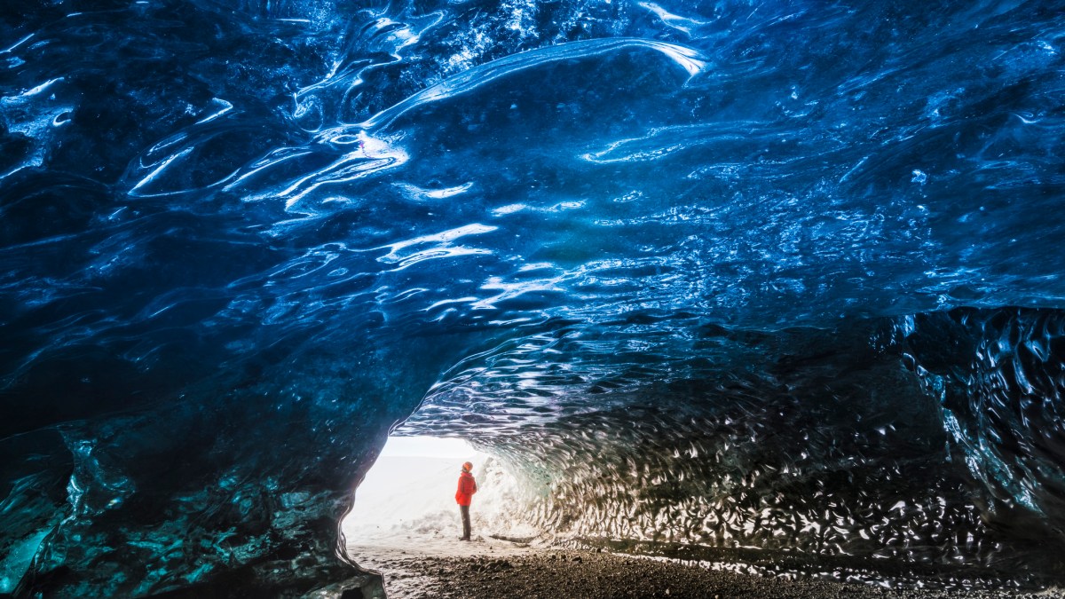 Man inside an ice caver under the Vatnajokull glacier, Vatnajokull National Park, East Iceland, Iceland. Photo by Marco Bottigelli / Getty Images