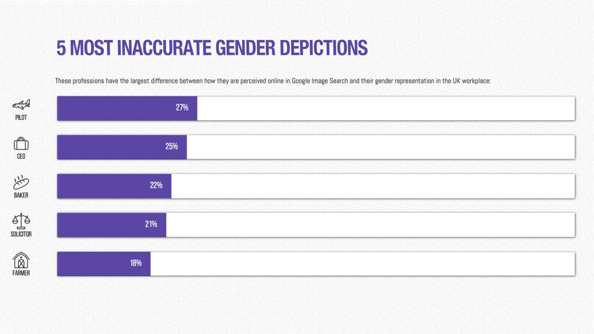 U.K. job-search website AdView analyzed the ONS data for “Employment by Occupation” and developed an interactive tool for assessing the disparity between the gender mix depicted by Google Image searches and the distribution of careers suggested by data. It’s plausible to imagine that the proportion of disparity between what’s presented and what’s real in the U.S. is at least roughly similar.