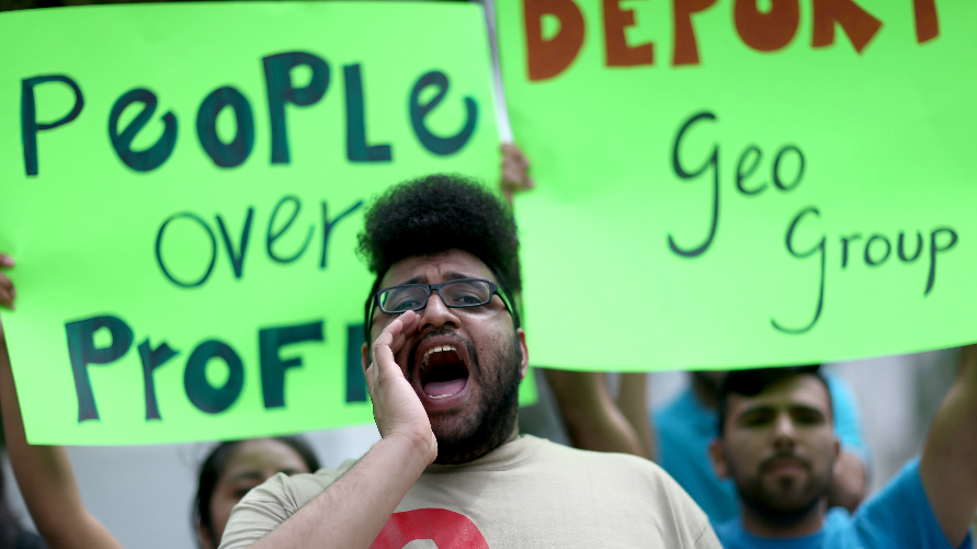 Photo: BOCA RATON, FL – MAY 04: Ruben Hayslette and other protesters gather in front of the GEO Group headquarters to speak out against the company that manages private prisons across the United States on May 4, 2015 in Boca Raton, Florida. The protesters are condemning what they say are the company’s active lobbying efforts to criminalize and imprison immigrants and people of color and then to make a profit off their imprisonment. (Photo by Joe Raedle/Getty Images)
