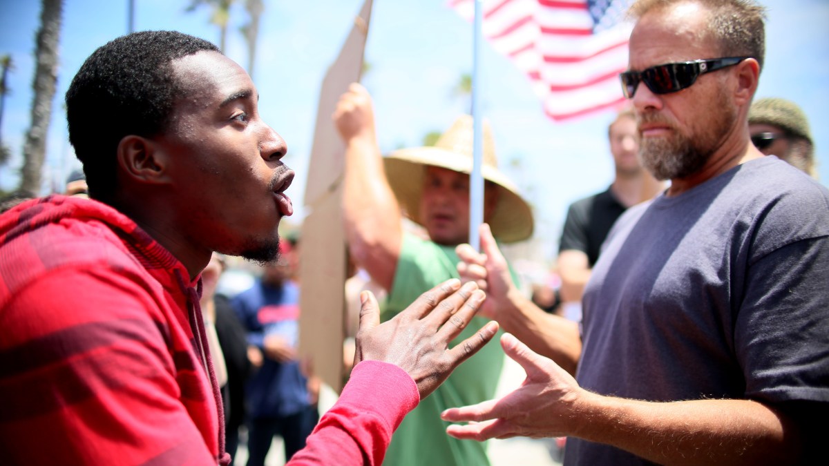 John Pope (L) expresses his disagreement with supporters of President Donald Trump near the Mar-a-Lago resort home of President Trump on March 4, 2017 in West Palm Beach, Florida. (Photo by Joe Raedle/Getty Images)