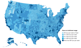 Here’s a map of the U.S. from the report showing how many hours you’d have to work at the $7.25 wage to afford a one-bedroom rental home at fair market rent.