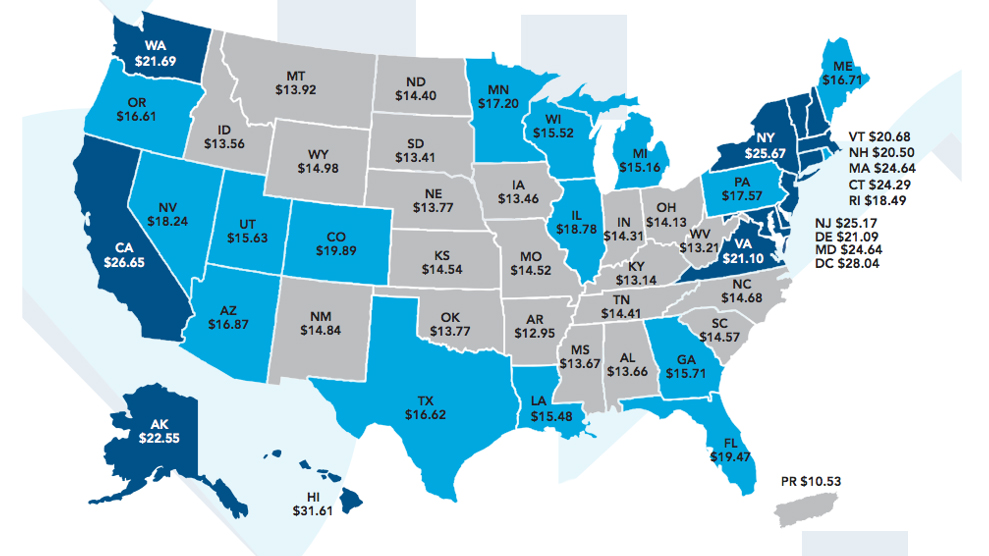 The costliest state is Hawaii, where the minimum wage recently raised to $10.10 but you’d need to earn about $75,000 a year to rent a modest two-bedroom home. The cheapest housing is in Arkansas, a state with an $8.50 minimum wage, where you’d still need to make about $29,000 a year to afford a two-bedroom rental at fair market price.