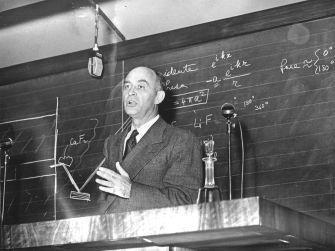 Professor Enrico Fermi (1901-1954), known for achieving the first controlled nuclear reaction, lecturing on the optical characteristics of neutrons at the Domegani Institute in Milan. (Photo by Keystone/Getty Images)