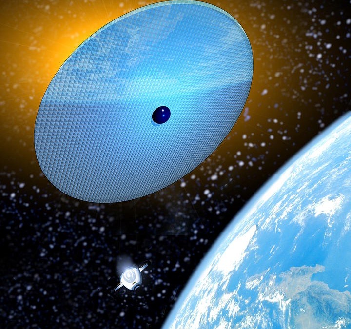 2.) Place a large space lens (or a series of smaller lenses) in orbit at L1. Proposed way back in 1989 by James Early, a device as simple as a glass shield a few millimeters thick could act as a lens, which would diffuse a large amount of sunlight away from the Earth. Because of how efficiently lenses can cause the Sun’s parallel rays to diverge (or converge for a brief while and then diverge), only about 1 million square kilometers (1 × 10¹² m²) of coverage would do the job.