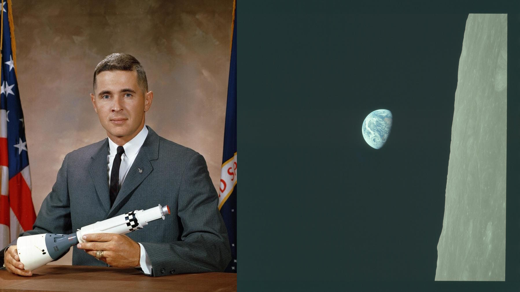 This NASA portrait of Apollo 8 astronaut Bill Anders (left) is shown alongside the most iconic photograph from that mission: Earthrise (right), shown in its original orientation as captured.