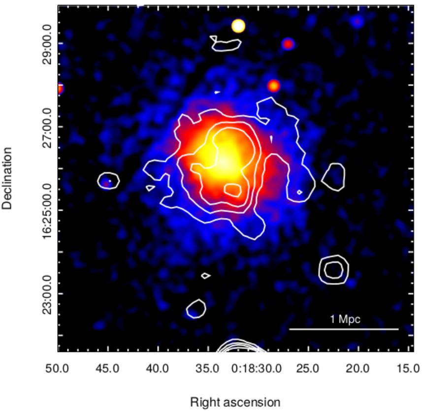 The X-ray data of colliding galaxy cluster MACS J0018.5+1626, as shown in color, also emits radio signals, as shown in the contours. This is an example of a head-on collision between two galaxy clusters, totaling more than a quadrillion solar masses all told.