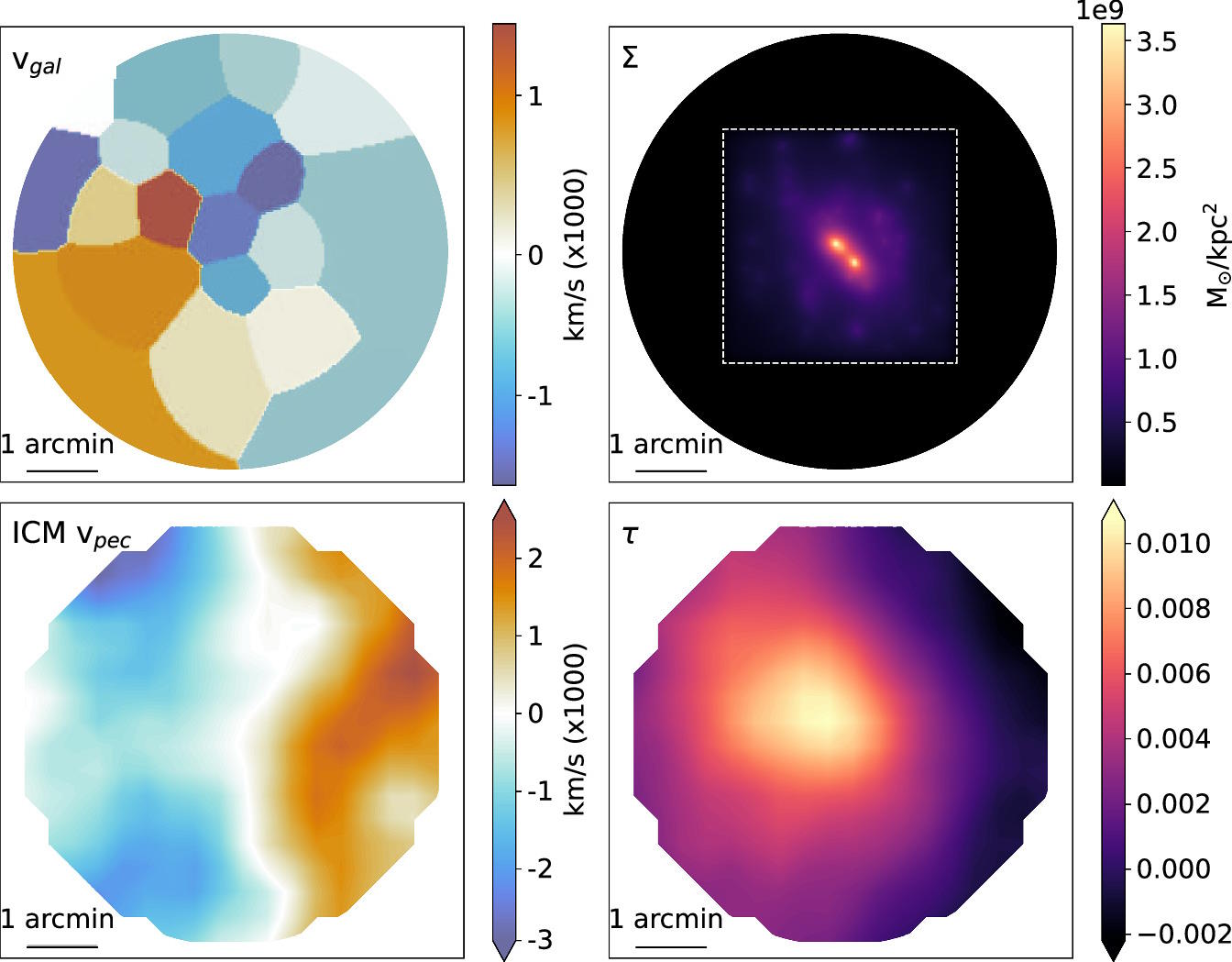 The left hand column shows the relative motions of individual galaxies (top) and the intracluster medium (bottom) within MACS J0018.5, while the right column shows the projected total mass (top) and the optical depth of the intracluster medium (bottom). The head-on nature of this collision makes it uniquely informative.