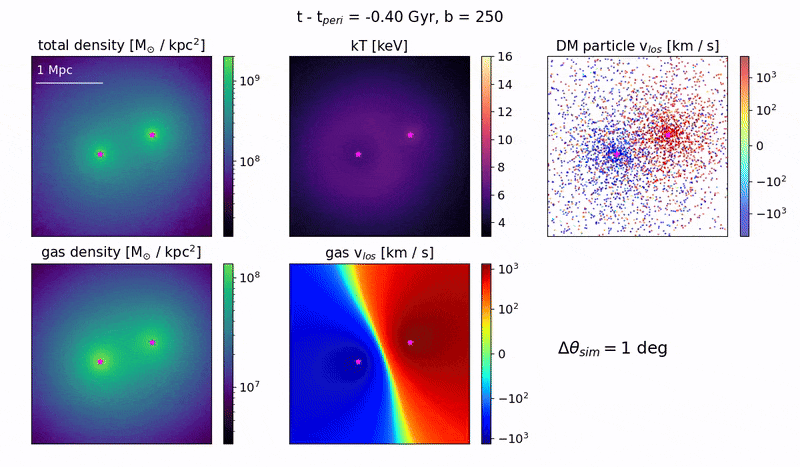 These animations show the simulated evolution of the intracluster medium and the dark matter speeds decoupling from one another, along with the total density, gas densities, and gas temperature. The changing angle shows how the DM vs. gas velocity dipoles misalign throughout the collision process.