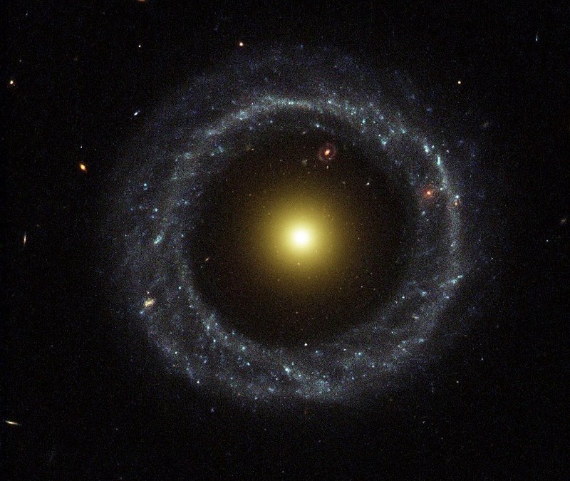 For the other ring galaxies we find, they involve a small galaxy colliding with a larger galaxy at relatively high speeds. The collision produces a density wave in the larger galaxy, causing matter to be pushed outward, which can trigger star formation in the outskirts. Images of these interacting galaxies are some of the most beautiful, natural sights that the Universe has to offer.