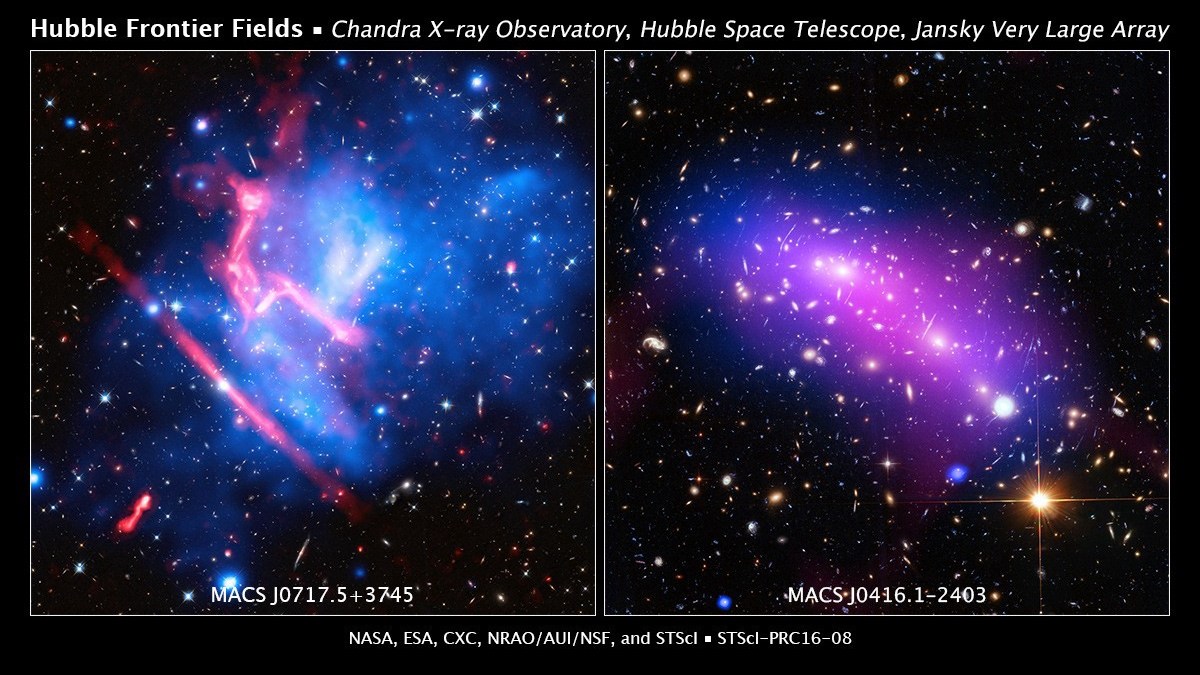 While cluster MACS J0416.1–2403 (above, in the radio) showcases a simple collision in the early stages between two large galaxy clusters, MACS J0717.5+3745 (below) is much more complicated.
