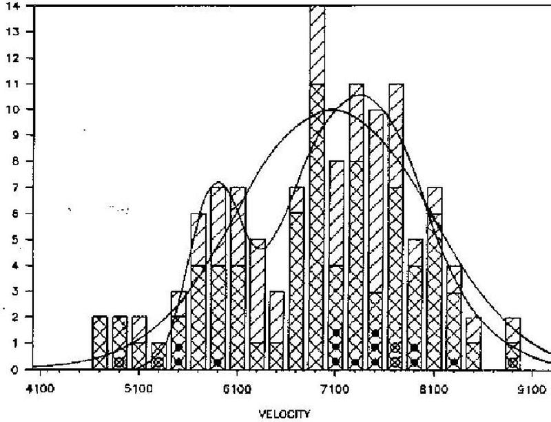 On average, he found that all of the galaxies within the cluster were receding from us at a fairly large speed: somewhere around 7000 km/s, when you aggregate them together. But individually, he found that there was a large distribution for the implied motion of any one galaxy in particular. Most of them moved at somewhere close to 7000 km/s: several hundred km/s either above or below that mark, but there were others, and a substantial number of them that moved away from us at only 6000 km/s or less, and an equal number that moved away from us at 8000 km/s or more. It was like a large number of galaxies were being pulled toward us, by some extra amount over the average, and an equally large number were being pushed away by an equivalent amount.