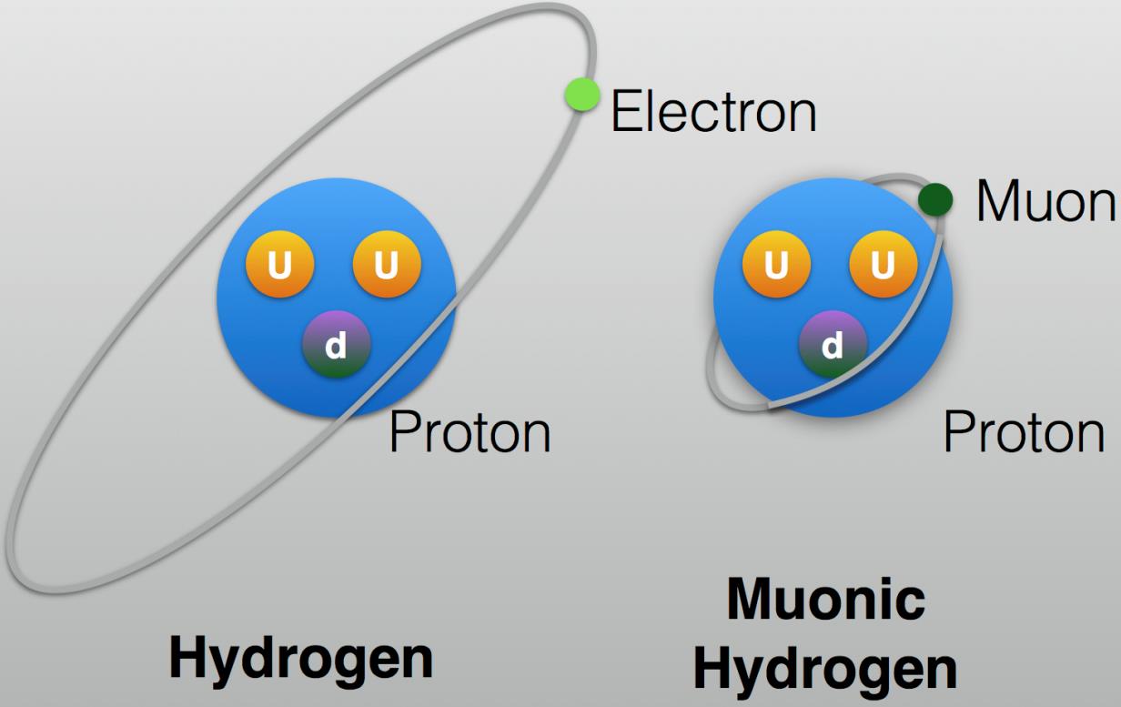 Perhaps the biggest difference is in terms of energy levels. Normal (electron-containing) hydrogen has only a specific set of energy levels that it can occupy: the ground state (n=1), the first excited state (n=2), all the way up to a fully ionized state (n=∞), and in order to rise up in energy level, a photon of the proper energy needs to interact with it. To go from the ground (lowest-energy) state up to the first excited state, an energy of 10.2 eV (electron-volts) is needed; to fully ionize, an energy of 13.6 eV is needed. Because a muon has 206 times the mass of an electron, it takes 206 times the energy. Muonic hydrogen can’t become excited unless a photon of 2.1 keV (or kilo-electron-volts) strikes it, and can’t become ionized unless a photon of at least 2.8 keV encounters it.