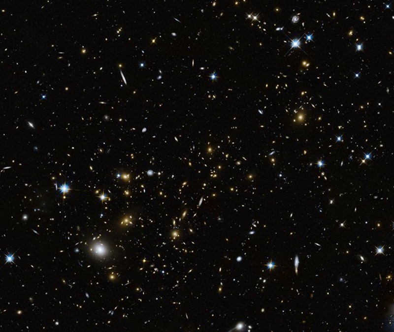 The galaxy cluster Abell 68, and its many lensed and distorted background galaxies. Image credit: NASA & ESA. Acknowledgement: N. Rose.
