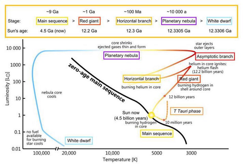 The evolution of a solar-mass star on the Hertzsprung-Russell (color-magnitude) diagram from its pre-main-sequence phase to the end of fusion and its eventual transformation into a white dwarf. Every star of every mass will follow a different curve, but the Sun is only a star once it begins hydrogen burning, and ceases to be a star once helium burning (in both the core and in all shells) is completed. Stars on the upper-left of the diagram (on the main sequence) are more massive, hotter, and more luminous than our Sun, but are also the shortest-lived.