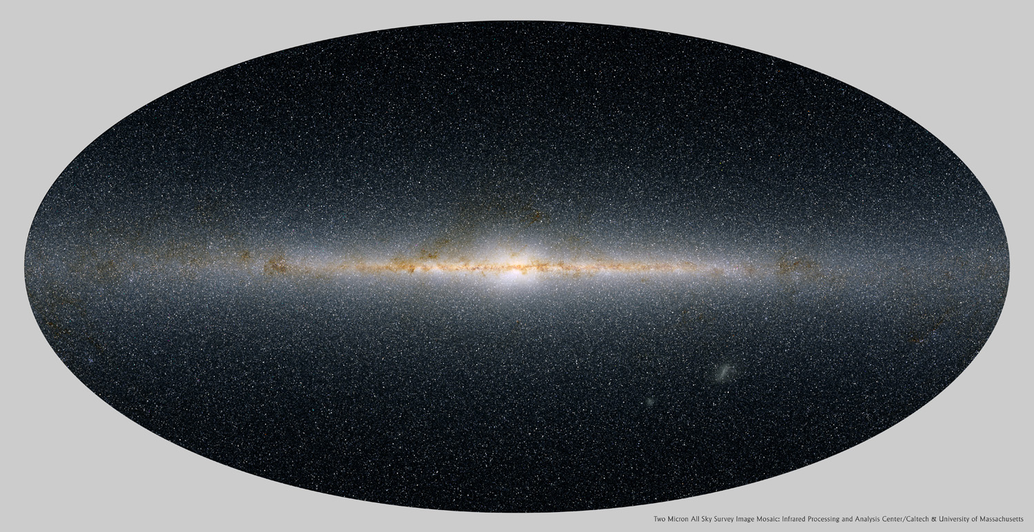 This is because the light-blocking material that the galaxy is filled with is largely composed of grains of dust of a finite size: a size comparable to the wavelength of light. In general, dust is very efficient at blocking light of wavelengths that are shorter than the size of the dust grains, and progressively less efficient at blocking light of longer wavelengths. (This is why dust-obscured regions appear redder, and dust-free regions appear bluer.) If we apply this technique — of looking at the whole sky, including the plane of the Milky Way, at longer, infrared wavelengths of light — we can do an outstanding job of “seeing through” the light-blocking gas and dust, and thereby reveal the stars that are located both within and behind those dust clouds, dust lanes, and any other shaped features that dust can produce.