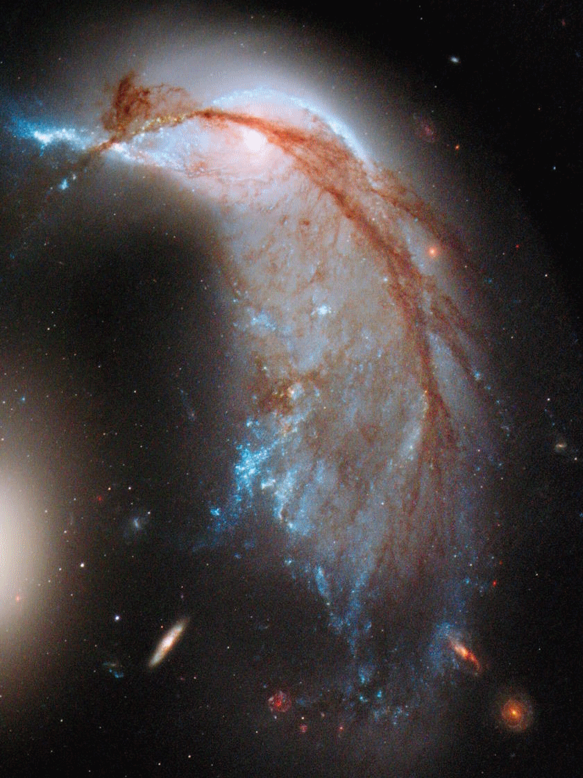 This interacting pair of galaxies, cataloged as Arp 142, was dubbed “the Penguin and the Egg” after the Hubble Space Telescope revealed this view of the two member galaxies: the extended NGC 2936 and the compact NGC 2937.